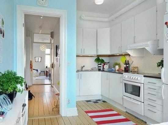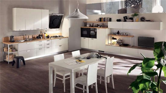 开放式厨房与客厅、餐厅安排在同一空间中,主人用餐、烹饪时也可以随便看电视,小户型住宅不妨参考这样的装修。