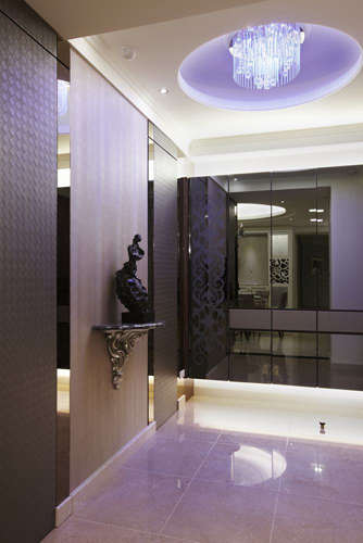 编辑推荐:青玉石大片铺陈的地面打造奢华风格,端景上金箔画墙在光影投射中,搭配一幅画和一件艺品,一旁双色皮革混搭的鞋柜门片,于悬浮处设计抽拉座椅,完善了生活机能。