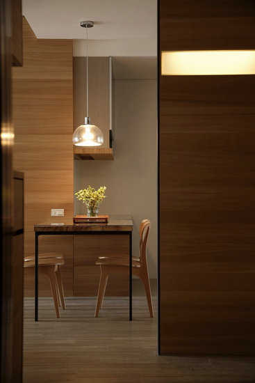 编辑点评:因应夫妇两人的生活型态,有别于传统制式的餐厅设计,餐桌就位于玄关动线端底处。
