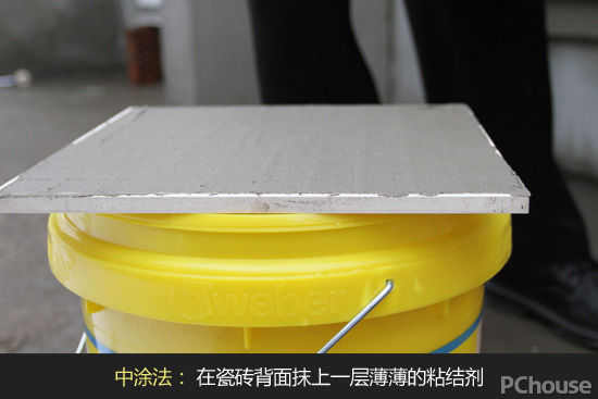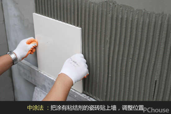 与薄涂法用同样的手法在粘结剂上刮出线条,瓷砖背面抹上一层薄薄的粘结剂,将瓷砖贴好调整完毕之后,使用橡胶锤把瓷砖敲实。
