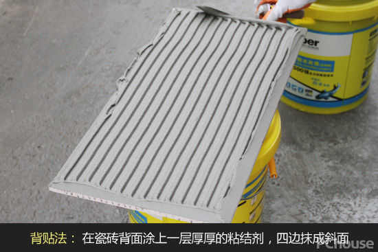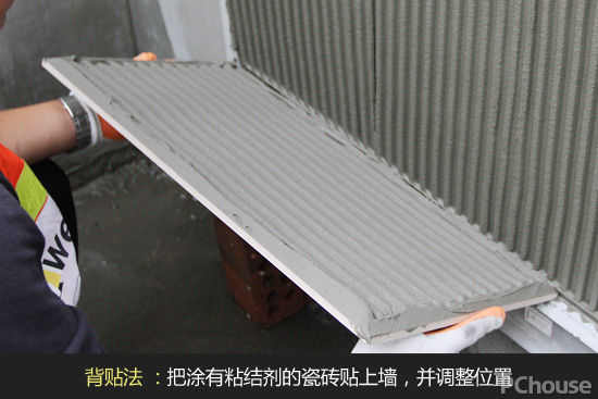 背贴法与中涂法手法类似,但瓷砖背面的粘结剂要更多,并用锯齿镘刀在瓷砖背面的粘结剂上刮出线条,四边抹成斜面,避免与墙面上的粘结剂互相挤压而溢出弄污瓷砖。