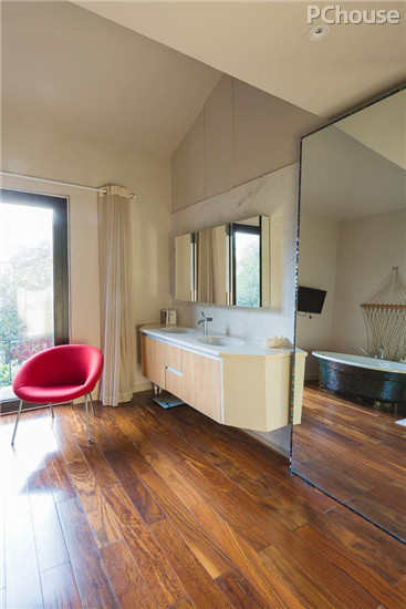编辑点评:更具个性的还有主人的浴室。浴室内充满了光感,设计师先用米黄色涂料打底,随后用白色油漆刷出自由肌理,用悬挑结构支撑的“一步阳台”,让卫生间的双开门能够完全打开,与室外更紧密地连通。