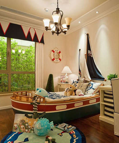 小编的话:海军风的儿童房一定会带给孩子无限遐想空间,把床打造成船的造型,墙面上的救生圈装饰都显得逼真形象。从吊顶上照射下的灯光在白色立体条纹的墙面上,整个儿童房空间层次感丰富且具有童趣。
