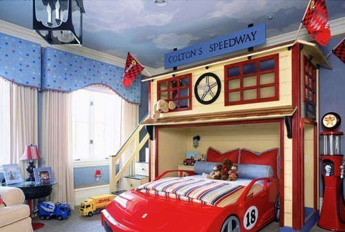 小编的话:以跑车造型打造出的床,与前一款有异曲同工之处,以修车厂元素作为儿童房主题,还特别搭建了二层小阁楼,可以让孩子在这里尽情玩耍。天花板则被刷成了天空色,抬头仰望,在自家天花板上就能看见蓝天白云,这样的儿童房相信孩子一定会喜欢。