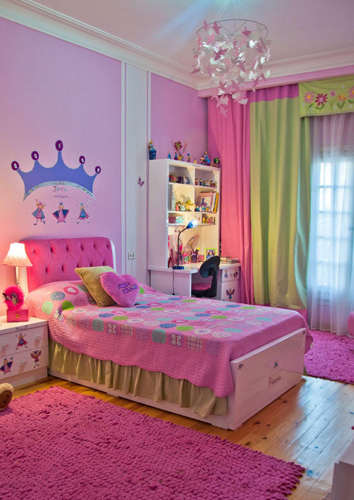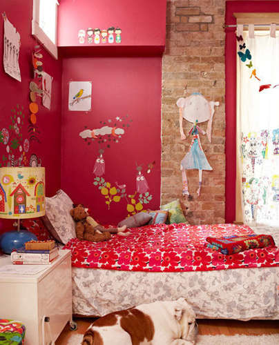 小编的话:以零星贴纸为主的玫瑰红色儿童房,给人印象是热情奔放,而以陈旧砖墙来中和色调,在视觉上可以让孩子心情不会太过浮躁,在墙上贴上一些可爱的墙贴,整个房间里都充满了孩子喜欢的贴纸元素,再配以如此艳丽的颜色,给予孩子一定的想象空间。