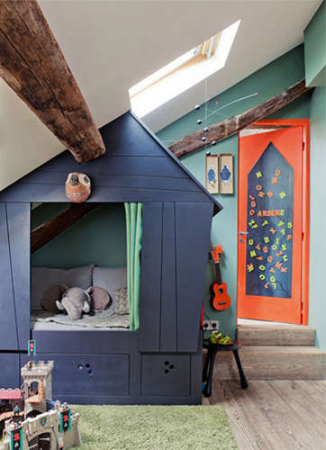 小编的话:在儿童房里搭建一个小木屋,木质地板配上绿草般的舒适地毯,让孩子在房间里会有种在室外的感觉,屋中屋的设计还能够给孩子一定的空间安全感。