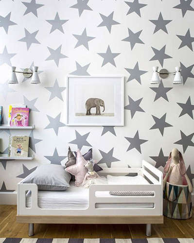 小编的话:白色墙面上的灰色大颗的星星填满了整个墙面空间,能够放上几本童话书的白色搁板,画框旁对称的两盏白色壁灯在夜间散发出暖色调灯光,能够有助孩子入眠。