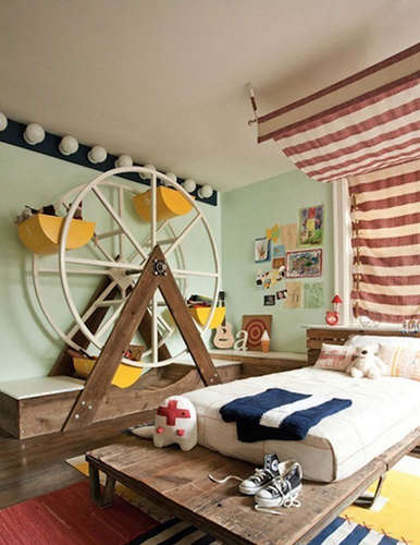 小编的话:游乐园主题的儿童房绝对是孩子们眼中的天堂,特别是在房间里把储物架打造成迷你摩天轮的造型,在能够收纳下不少东西的同时,还巧妙的贴合了房间主题,美观实用又好玩,这样的儿童房有哪个孩子会拒绝呢?