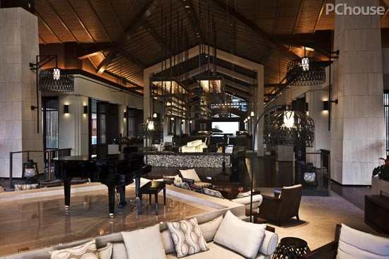 编辑点评:高雅内敛的深褐色空间,搭配原始简约的石材,耐看而不沉闷。造型各异的灯饰以不同的高度和形式悬挂在大堂,营造出动感的视觉效果。虽然这只是入住酒店时最先经过的地方,但却会让人不自然地放慢脚步,想要这优雅的地方稍作歇息。