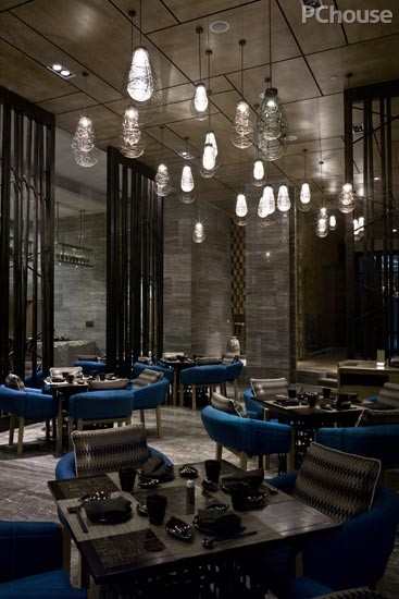 编辑点评:在特色餐厅中,螺旋形的吊灯错落分布,蓝色的椅子与温馨的灯光共同营造出静谧浪漫的氛围,入口处采用混搭的手法将彩贝拼成的水墨画配以东南亚特色的装饰罐及茅草坡屋顶,将现代中式空间与自然海南文化融合在一起。