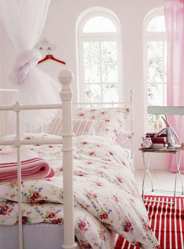 白色墙面、白色铁艺床、白色轻纱帷幔……纯白色的主色调给人纯洁清爽之感,搭配小花图案床品,唯美的感觉迎面扑来。红底白条纹的地毯十分活泼热情,让人眼前一亮。