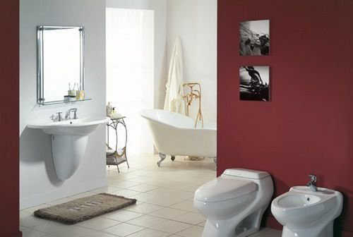 中国红配上黑白的壁画的背景墙,黄色的黄边白顶的独立式台盆、浴缸和马桶相应整套,整体感特别强。浴缸前放拖鞋的木板特地垫高了一点,防止长期木板长期浸泡在水里而腐朽。