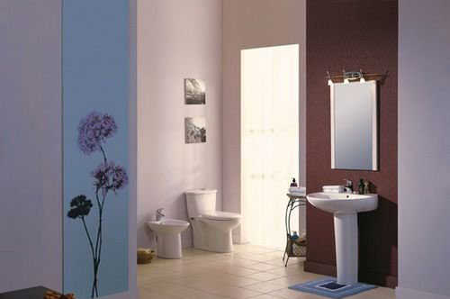 进一步将台盆缩小,放置在墙角的话能很好的利用墙的依靠,放置洗漱用品。壁纸和壁画都是花的图案,给卫生间增添了几分美感。