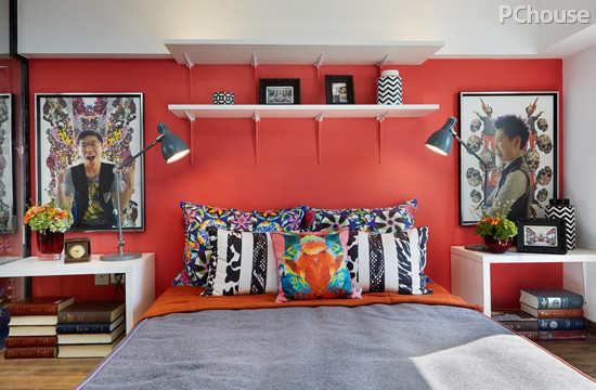 将背景墙刷成橙红色,搭配印花枕头和靠包,营造出“盛夏花开”绚烂多彩的氛围,为卧室注入无限的活力。挂上DIY设计的艺术挂画,个性十足。