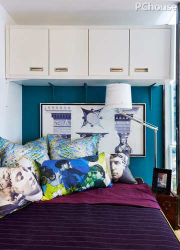 温馨贴士:床铺色彩深沉稳重,大胆地挑选撞色亮眼的靠包,就可以轻松打破空间沉闷,创造出十足个性。
