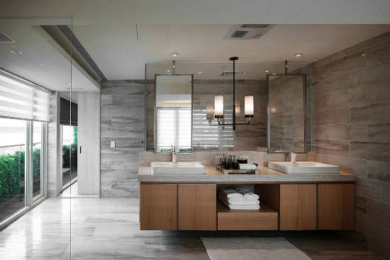 编辑点评:天然雪花石材搭配上进口磁砖,循序交织出卫浴空间的开阔及层次,另外,贴心使用者的隐私感受,盥洗台面后方的马桶区域,采以电控调光玻璃为材,结合上智能居家环控系统,让如厕、卫浴时光更加随心所欲。