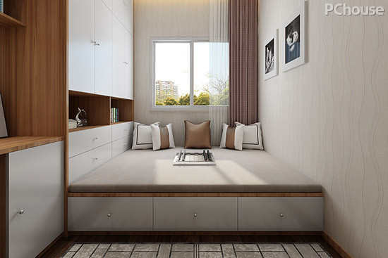 设计解读:根据本季PChouse联合索菲亚衣柜定制的福利,设计师根据业主需求,把客厅原有的阳台改成了一个室内的休闲区,在不影响采光与通风的情况下,置入了索菲亚现代简约榻榻米床、飘窗连体定制,供给屋主娱乐、学习、办公。