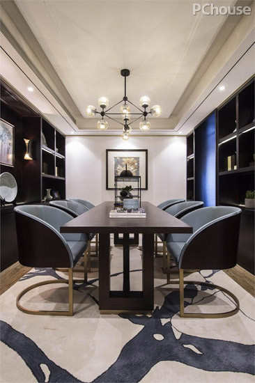 负一层画品中白桦树林、家庭图书馆的枝桠图案地毯,簇状水流玻璃吊灯设计展现了天青、水动、林静的自然意向;主卧室的泼墨图案地毯、圆形水珠玻璃吊灯、吊顶的竖型木格栅工艺,同样营造了气韵生动的空间流动感。