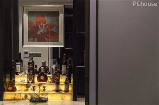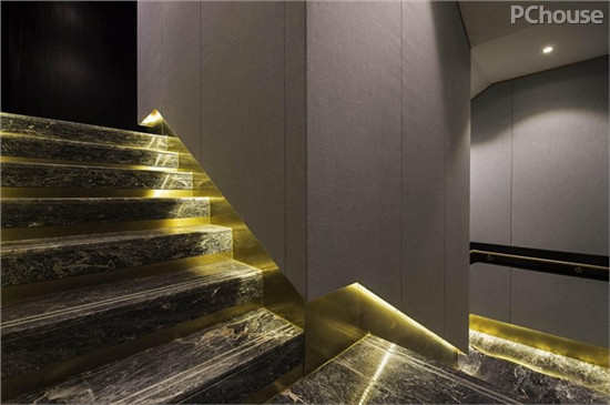 空间硬装使用不锈钢玻璃镜面、木作、石材、铜、软包等材质组合,打造富有轻奢气息居住文化,充分利用装饰细节,来打造各个搭配之间的微妙关系,楼梯间立面使用了暗藏灯带,行走在台阶,在大理石材质与昏黄的光影之间,展现了浪漫而富有层次变化的戏剧效果。