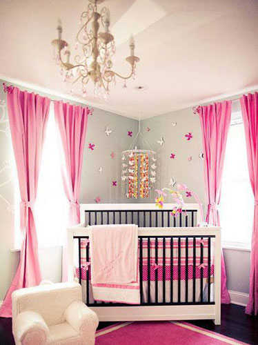 小编的话:以艳丽的枚红色作为主色调,肯定是想给予宝贝如公主般的疼爱,灰色的墙面稍稍中和了整个房间的艳丽感,墙上的立体花瓣更显层次感,顶部的水晶吊灯配上地上的艳丽地毯,使婴儿房看起来就如一个小小宫殿一般。