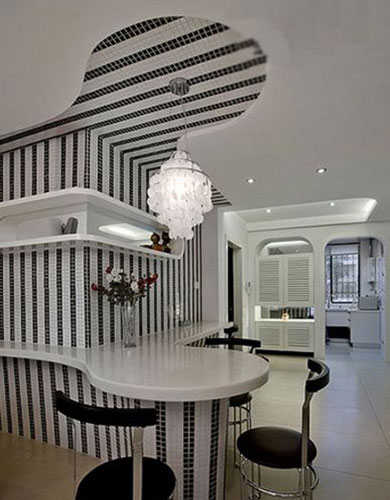 用黑白小格子拼贴成黑白相间的条纹状的吧台空间,把吧台打造成圆形桌面并在两旁还有所延伸的设计,使整个吧台在造型上就已经很出彩。而有心的房主人在桌面对应的天花板上还做了个对应的吊顶设计,使整个空间显得设计感十足,人性化的圆形台面更方便人们面对面交流。