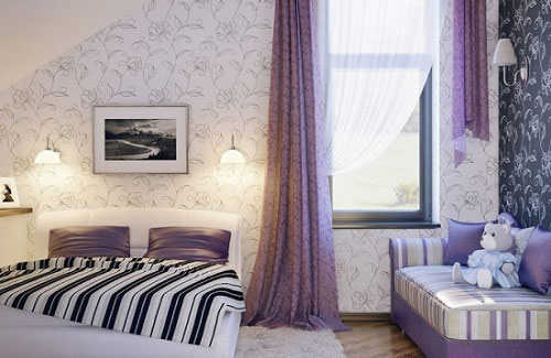 这间卧室就显得非常婉约,颇有小家碧玉的风情。多种浅色调构成的格子墙纸,正中央一大张娃娃图,以及一个可爱的玩偶,似乎就能感觉大小女孩的“萌”态。漂亮的水晶风铃,更为空间增色不少。