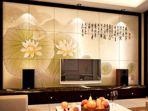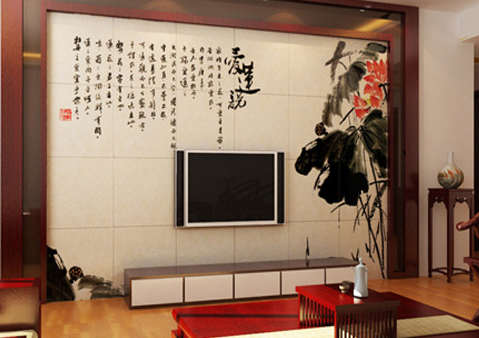 同样的出淤泥而不染,这款背景墙更显的浓墨重彩。水墨画的表现形式加之笔锋大气的《爱莲说》,成一股浓郁的艺术气息。