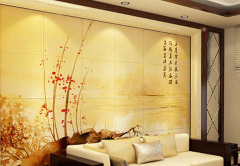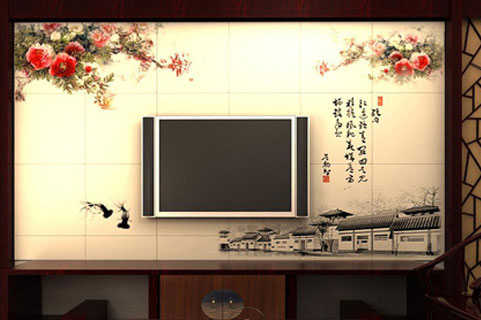 古镇的小桥流水搭配艳丽富贵的牡丹,如此个性的色彩渐变,凸显主人个性风格。这款背景墙最突出的地方莫过于将背景墙设计成屏风造型,展现更古韵的气息。