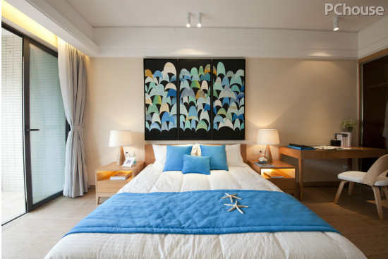 编辑点评:蓝色被褥的选择,与整个酒店的设计主题相呼应,置身其中,仿佛畅游于海洋世界。