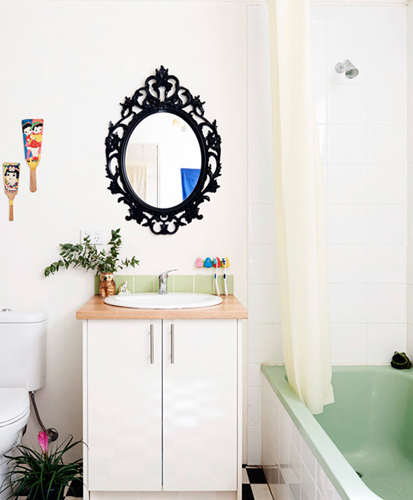 小编的话:浴室细节图。单品无一例外来自宜家。棋盘格地面延续了餐厅地面的风格。浴室柜上方六块绿色的小瓷砖和浴缸有相同的颜色,当时为了能够买到和浴缸颜色相同的瓷砖,爱丽丝在EABY上找了好几天。