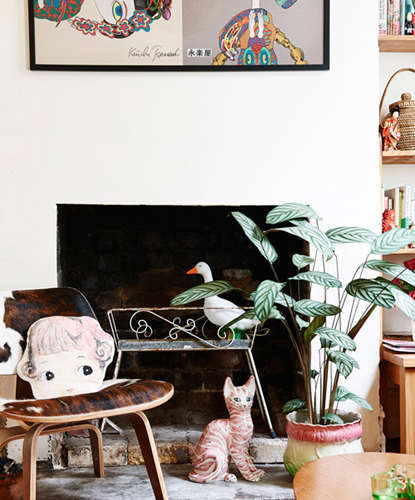 小编的话:客厅细节。壁炉上方的装饰画一眼就能瞧出日式风范。和这个角落的所有单品搭配都有一种日式的Q萌感,陶瓷小猫和陶瓷花瓶是在同一家店里购得的,放在一处搭配效果不错。马毛椅和娃娃头抱枕小编非常心水啊!还有仓做壁炉里的小鸭子看到了吗?这姐俩的家就是有这么多可爱的小细节!
