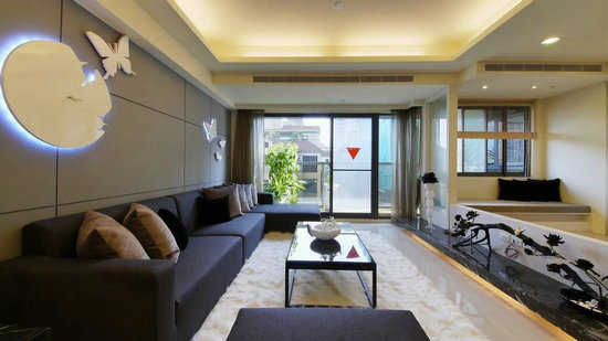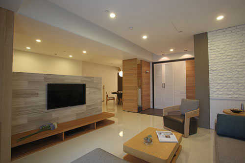 编辑点评:电视墙后方是一间小孩房,由于空间较小,因此挪了部份客厅的空间给小孩房用之外,将原来的墙面打掉电视墙以双面柜的方式设计,另一面就刚好成为小孩房的衣柜。