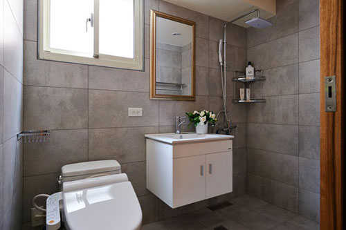 小编的话:空间不大的卫生间中,以浅灰色瓷砖铺贴墙面,让整间卫生间看上去干净整洁,开放式的淋浴区让这间卫生间看上去舒适感倍增。