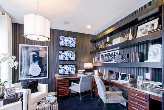 双人书房并不一定要有固定的样式或者空间,L型的书桌设计就适应任何角落以及过道,只要有墙面,搭上搁就会是很不错的书房工作区域,不局限于某一固定空间。