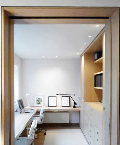 双人书房的设计要在考虑整体空间大小的情况下进行,靠墙放置的搁架样式面就很好的节省了空间,留出了开阔的空间给行走、活动。同样不仅仅可以共两人使用,后方窗下方的空间完全可以容纳下另一个。
