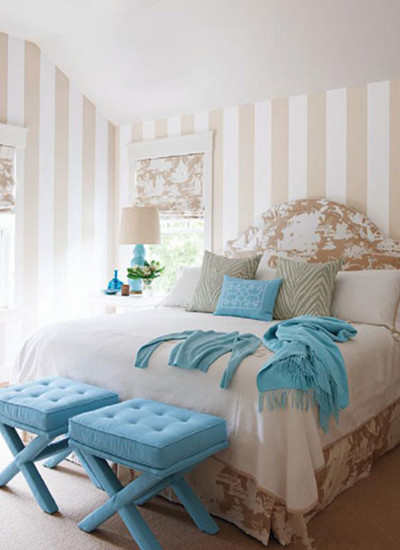 编辑点评:“接待室的印刷织物给人奇异的感觉,”设计师麦格在评价东汉普顿别墅时这样说道。但是米黄色和水蓝的调色很宁静。设计师也增加了一些大胆的条纹,让房间看起来更加有趣。“条纹给房间增加了奇异的感觉,”她说。床和窗帘来自China Seas,脚椅来自?Jonathan Adler,印加金白墙纸上的乳白色千禧条纹来自First Editions。