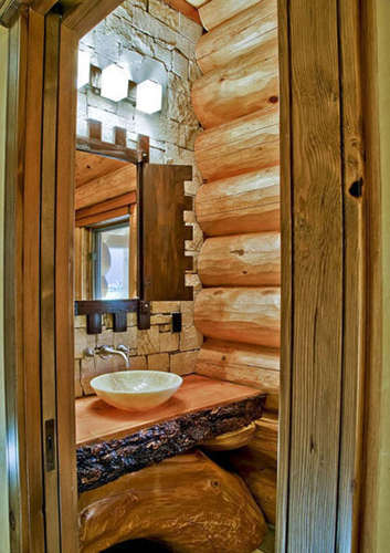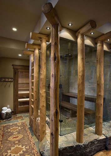 小编的话:卫生间内用石块结合玻璃淋浴房打造出来一款时尚中带着原生态感觉的卫浴空间,在玻璃淋浴房外面以木质圆柱围绕整间淋浴房,以顶部射灯来给予这间卫生间柔和的光线,整间卫浴空间中透出一种森林气息。