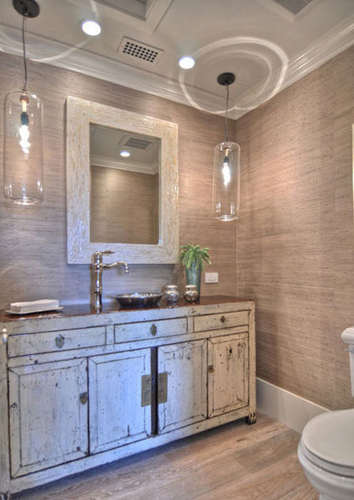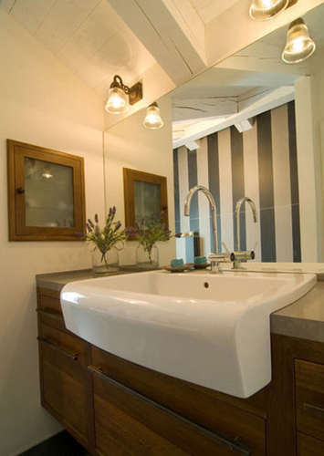小编的话:大面的镜面使这间卫生间在视觉上具有了空间扩容感,木质卫浴柜与白色内嵌式台盆组合,两盏暖色灯光让这间卫生间充满了时尚且古朴的气息。