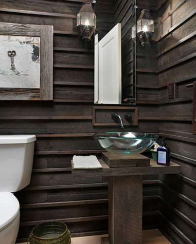 小编的话:深色木质立体墙面为这间卫浴空间从整体上增添了不少设计感,狭长的镜面与玻璃台盆在不同程度都让这间卫生间看起来显得精致迷人,镜面两旁对称的小壁灯为这间卫浴空间锦上添花。