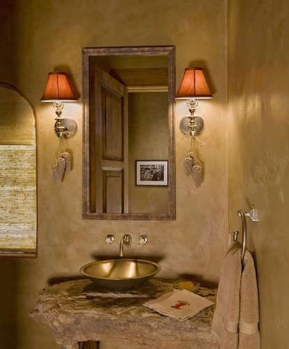 小编的话:橘色灯罩的小壁灯为这间卫浴空间增添了些许温馨氛围,洗漱区域的墙面上,大小适中的镜面与粗犷的台盆桌在质感上形成对比,这间卫生间让居住者会有种更贴近自然的感觉。