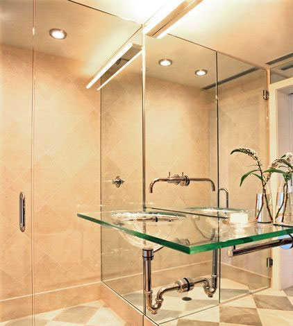 3.最大限度提高玻璃水槽的透明度。对角铺设地砖和全身镜子将增强这间浴室的开放性。