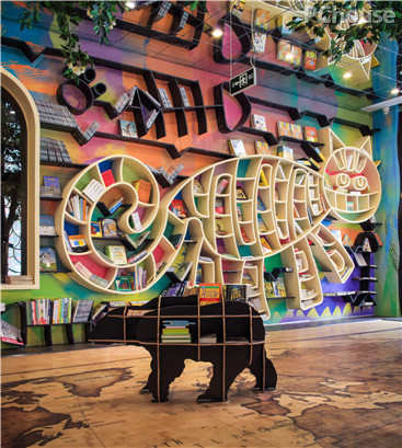 地面上的地图上同样站立着各种动物,他们既是代表不同大洲上的代表生物也是书架。也许,动物的心灵和小朋友是最相同的,所以设计师用”梦幻动物园”这个概念为小朋友们打造了一个缤纷梦幻的动物园童书馆。