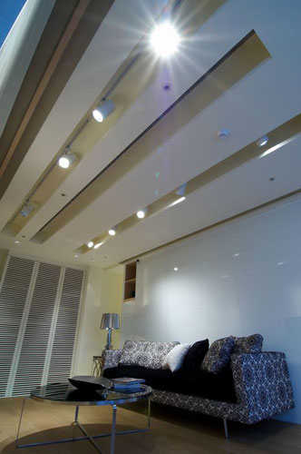 编辑点评:为了掩去建筑体的梁柱,天花设计藉由凹凸造型、搭配接接光源,形成光影层次感的错落旨趣。