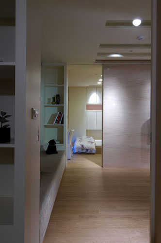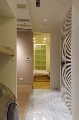 编辑点评:以大理石作为玄关地材与客厅架高规划的实木地板做区域的界定关系,延伸至卧眠区域,其间格状的收纳柜成为空间的端景。
