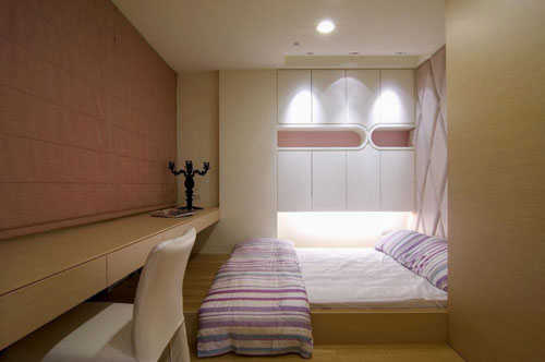 编辑点评:透过菱格状的裱布作为主墙背景,卧眠区以架高木作设计,柜体以白、粉红及弧线造型规划,铺述出女孩浪漫优雅的生活态度。