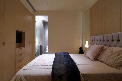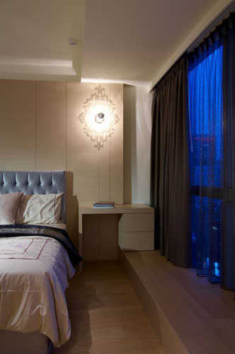 编辑点评:主卧于窗下以木地板架高的方式设计为卧榻区,具休闲观景的生活机能,床头壁灯以古典的造型形塑出优雅的光影效果。