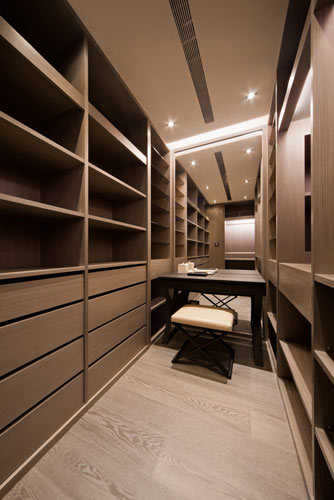 编辑点评:客厅电视主墙后方的更衣间,透光、不透明的镜材选用,光影流动化解密闭压迫。
