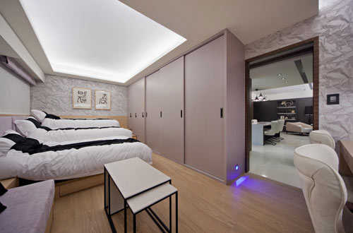 编辑点评:因屋主三位千金有着极佳感情,设计师谢启明将原有的两房打通,规划一大房空间使用。