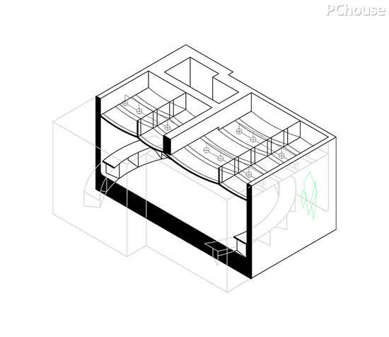 编辑点评:设计师在空间中置入两个元素:一个圆和几段连续的弧。圆,中心性最明确的几何图形, 将两个房间在视线上连续为一体,并在行为上给出一个明确的汇聚点。
