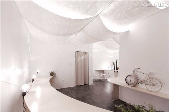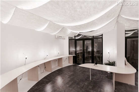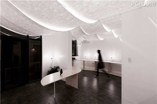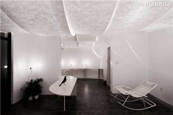 编辑点评:几段连续的弧是对空间剖面的设计, 强烈的方向性和连续的视觉效果将两个房间联系为一体,又创造出天幕或是流云的效果。